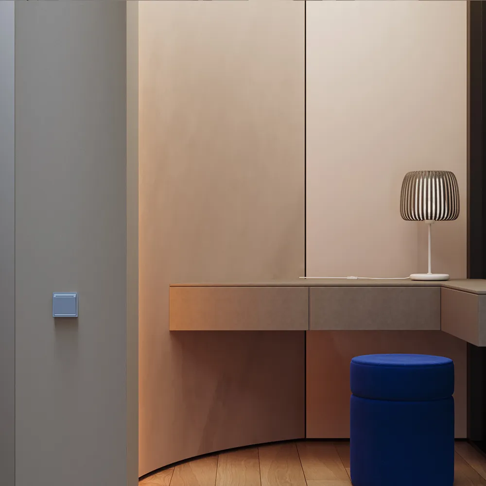 • Деним — оригинальный акцент — серо-голубой оттенок с покрытием Soft touch не отражает бликов и не собирает отпечатков. На светлых стенах создаёт выразительный контраст, на тёмных — визуально «растворяется», оставляя ощущение цельного пространства. Идеален для отелей любого формата: от минималистичных апарт-отелей до премиальных бутиков с монохромной палитрой.